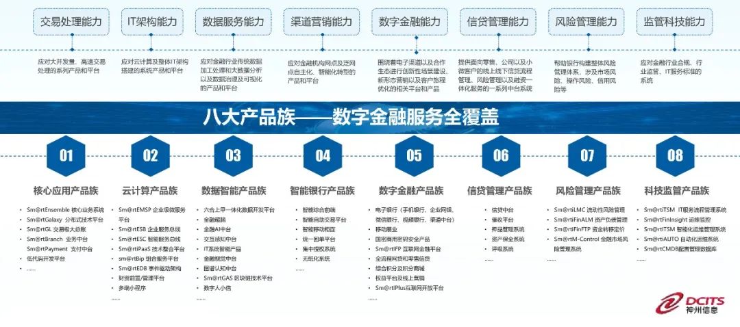 核心应用产品族、云计算产品族、数据智能产品族、智能银行产品族、数字金融产品族、信贷管理产品族、风险管理产品族、科技监管产品族。八大解决方案200余款金融应用软件产品,满足金融机构数字化转型全方位需求。